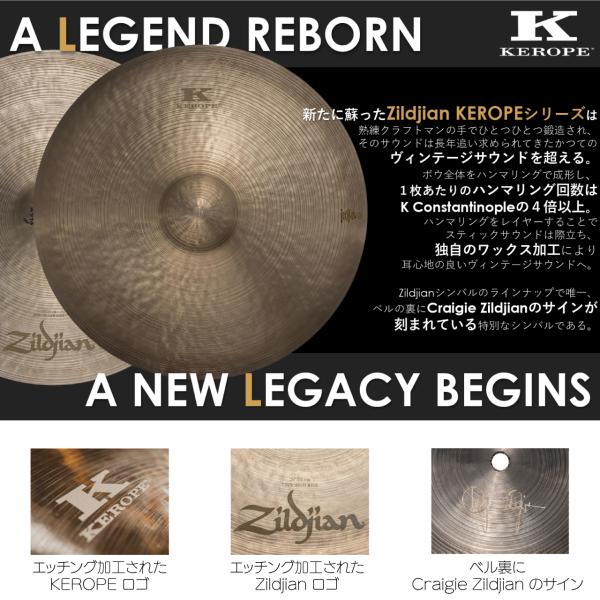 スティック・サウンドを際立たせ、ブラシワークにも適している伝統的な深めのピン・レイジングを含むレイジング・パターン、独自のワックス工程、通常の2 倍のサウンド・テスト、これら全てがKerope の象徴的な特性を実現するために不可欠なもので、その語り継がれる歴史に忠実なサウンドを響かせています。 すべてのKerope のベルには、オリジナル・シンバルの伝統に習って、他にはないCraigie Zildjian の署名が刻印されています。
