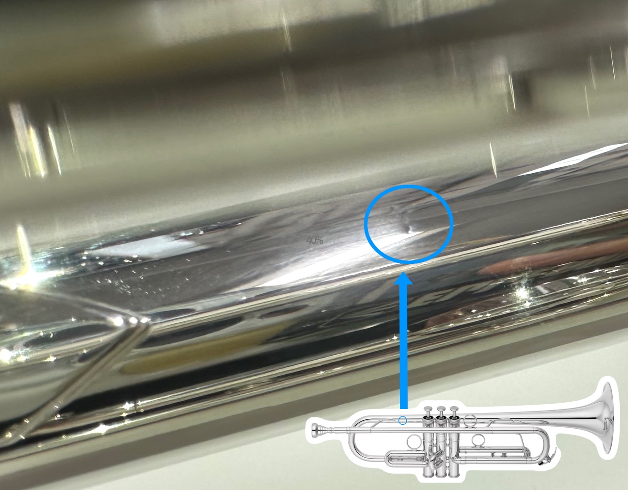 メーカー検品見落としでベル胴のべ座付近にキズがあります。(楽器を構えて手前側、ベルののべ座付近)