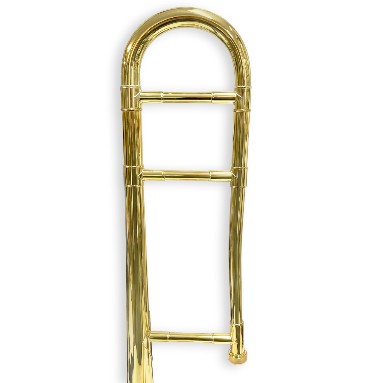 上記テナートロンボーンに、主にF管を取り付けたもの。B♭管からレバーでF管に切り替えられます。これによって低音域が拡大し、出せる音が増えます。また6、7ポジションで出す音がF管を使用することで1番、2番ポジションで演奏することができます。操作性が向上しますので早いパッセージの曲を演奏する場合や体格、経験によってこちらを選ぶ場合があります。ただし、管が増えますので楽器が重くなります。