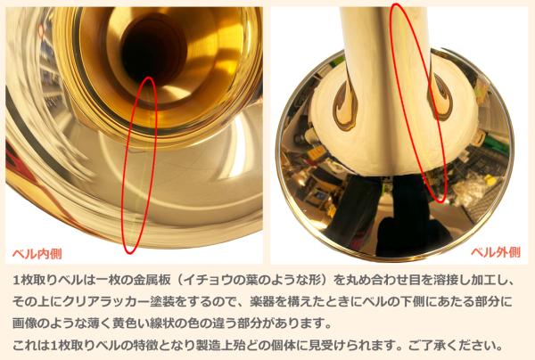 スライドの中管の内径が上下管で違い、上管(マウスパイプ側)より下管(ベル側)が太くなっています。これによって音色や音の広がりが微妙に変化します。本体、ベルジョイント側は中細管になります。