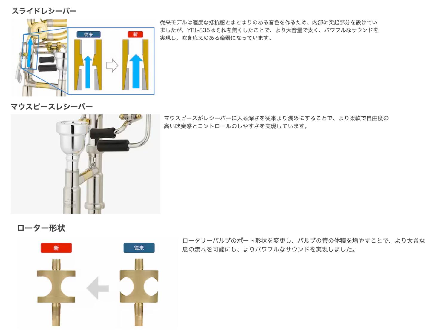 YBL-835共通仕様:B♭/F/G♭/D、主管抜差管材質ゴールドブラス、スライド外管材質イエローブラス 、インライン