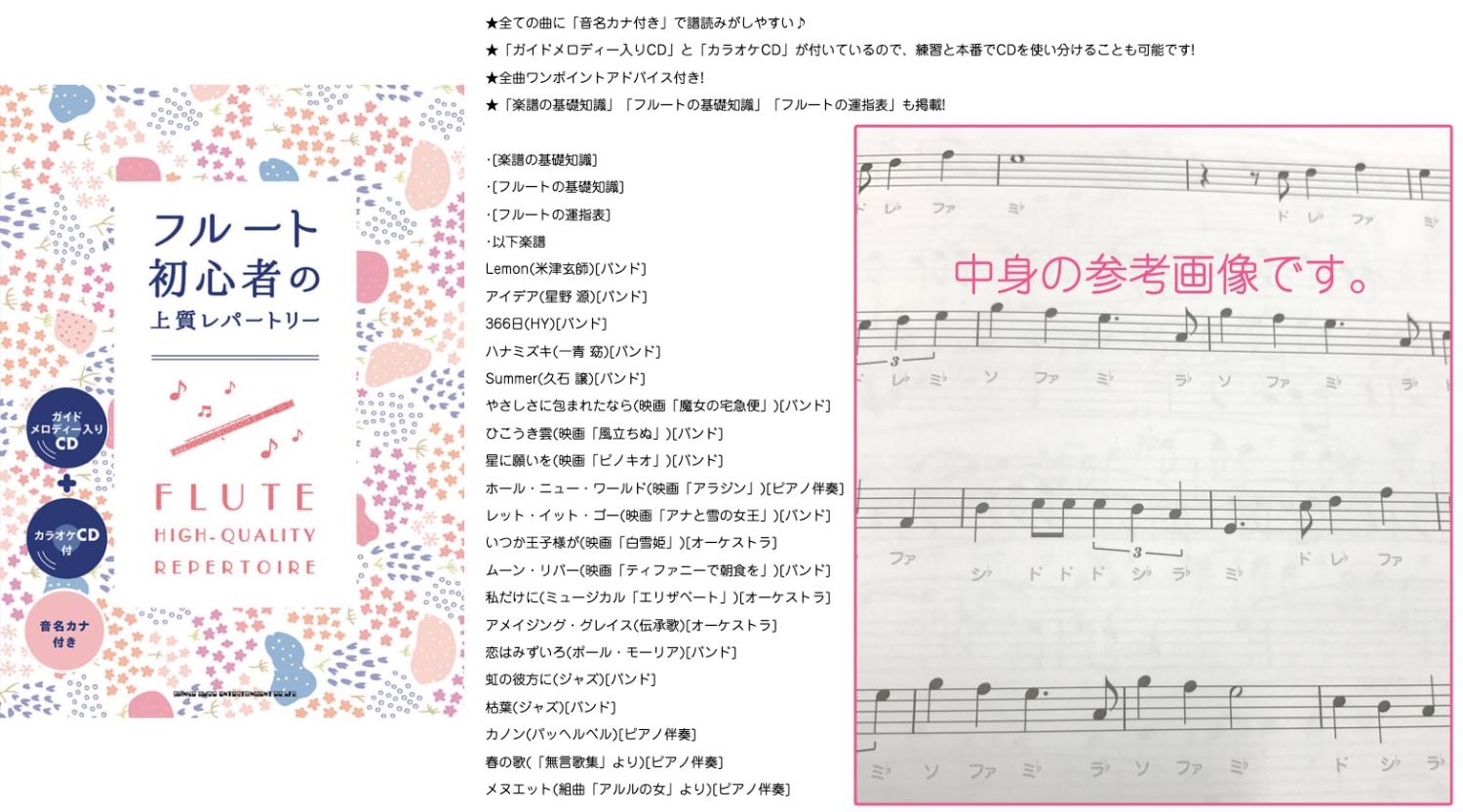 ■フルート 初心者の上質レパートリー...音符の上にドレミが書かれた超初心者用楽譜。Lemon/アイデア/Summer/星に願いを/レット・イット・ゴー/枯葉/カノンなどなどポップス、クラシック、ジャズまで幅広いジャンル。CD付き。