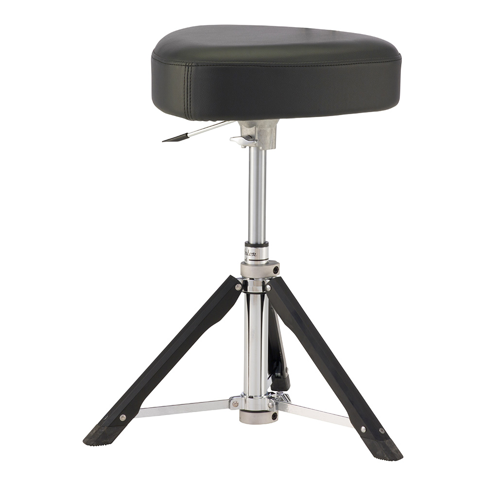 軽量で迅速に高さ調整ができるガスリフト式の脚部を採用した、三角型シートのドラムスローン。ドラマーのみならず、キーボーディストなど様々な楽器奏者にもおすすめできる。高さ調整が迅速におこなえ、かつ軽量化を図ったガスリフト式の脚部を採用したドラムスローン。ガスシリンダーのクッション性はドラマーの腰への負担を和らげ、長時間の演奏が快適に行える。この脚部に加え、密度の異なるクッションを適所に採用し、2ウェイで使用できるユニークな三角形状のシート、シート回転の有無を選択できるストッパーなど、全てが新たに開発されたもの。オプションでバックレストの取り付けも可能。(*バックレストを取り付けた場合、三角形の頂点を前にしたサドルタイプのみでの使用となります。)