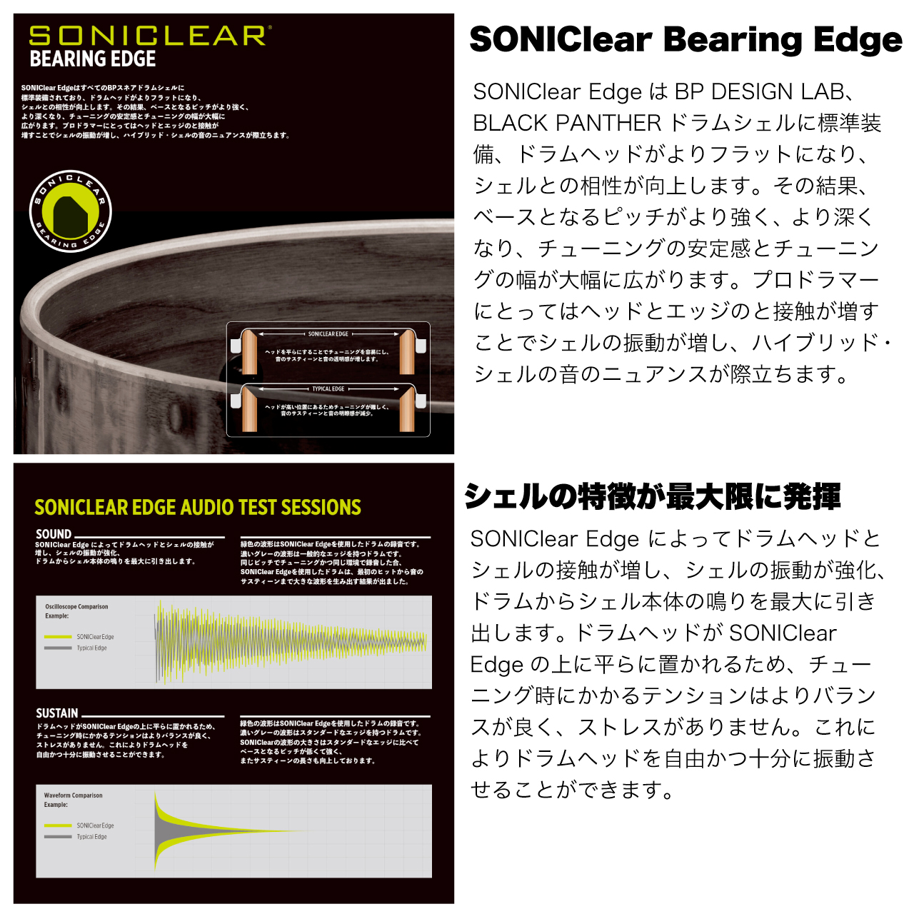 SONIClear EdgeはBP DESIGN LAB、BLACK PANTHERドラムシェルに標準装備、ドラムヘッドがよりフラットになり、シェルとの相性が向上します。その結果、ベースとなるピッチがより強く、 より深くなり、チューニングの安定感とチューニングの幅が大幅に広がります。プロドラマーにとってはヘッドとエッジのと接触が増すことでシェルの振動が増し、ハイブリッド・シェルの音のニュアンスが際立ちます。