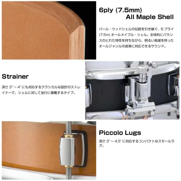 サイドスネアとして威力を発揮する、ウォームなメイプル材を採用した13"ピッコロ。ハイピッチでキレの良いサウンドは、ダイナミックレンジを広げ、ビートにインパクトを与えてくれる。。