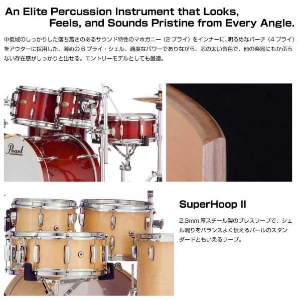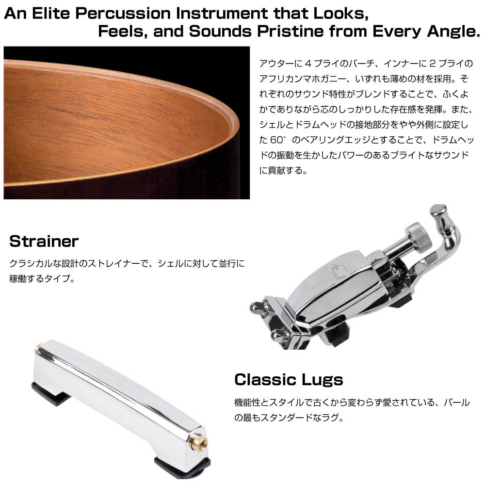 マホガニー&バーチをミックスすることで適度なパワーとサスティーンが得られる、エントリーモデルとしても最適なウッドスネアドラム。中低域のしっかりした落ち着きのあるサウンド特性のマホガニー(2プライ)をインナーに、明るめなバーチ(4プライ)をアウターに採用した、薄めの6プライ・シェル。適度なパワーでありながら、芯の太い音色で、他の楽器にもかぶらない存在感がしっかりと出せる。 エントリーモデルとしても最適。