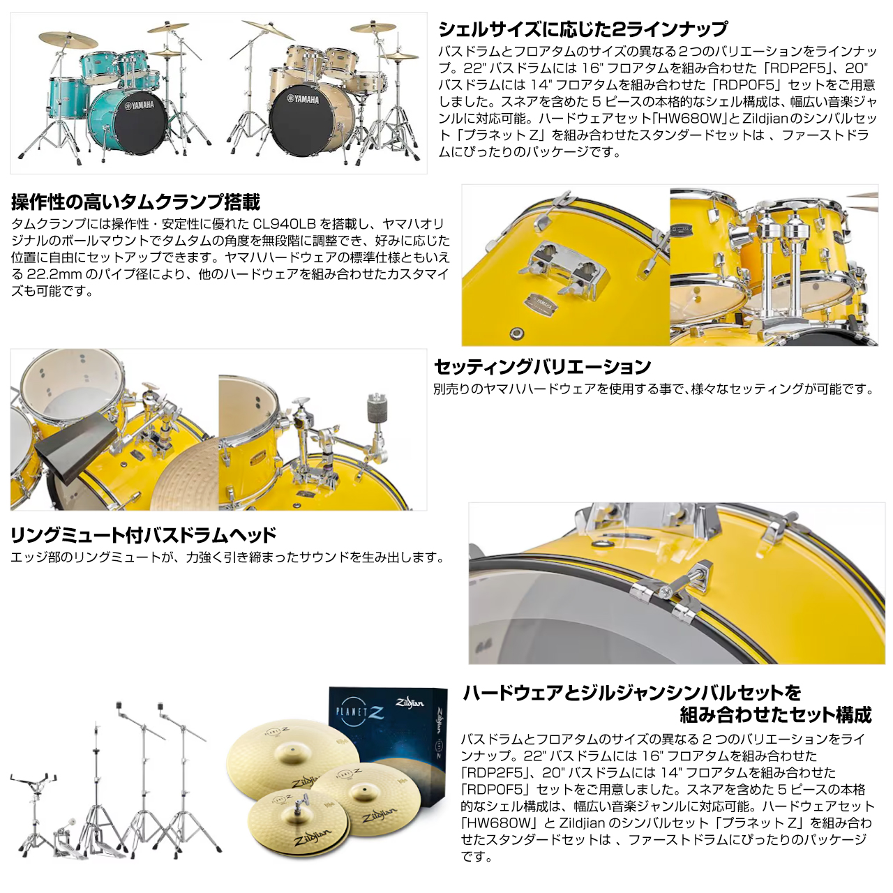 ドラム初心者から演奏を楽しんでいる中級者まで、幅広いプレイヤーがドラム演奏を楽しむために必要な全てを備えたエントリードラムセット「ライディーン」。20"バスドラム、14"フロアタムをベースにしたセットアップ。フルセット!【 操作性の高いタムクランプ搭載 】タムクランプには操作性・安定性に優れたCL940LBを搭載。ヤマハオリジナルのボールマウントは、タムタムのセット角度を無段階に調整でき、ご自分の好みに応じた位置に自由にセットアップできます。ヤマハハードウェアの標準仕様ともいえる22.2mmのパイプ径により、他のハードウェアを組み合わせたカスタマイズも可能です。