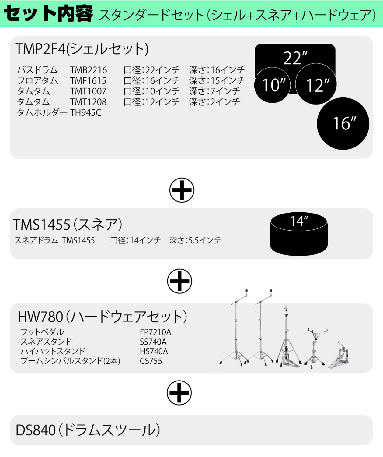 トッププロの要求に応える高い演奏性と音質を兼ね備えたドラムセットを、ミドルクラスの価格帯で実現!こちらは22インチバスドラムに16インチフロアタムをベースとしたスタンダードセット!シンバルは別売です。