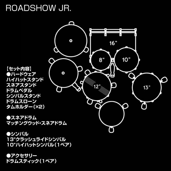 16”x10” バスドラム、13”x8” フロアタム、10”x5.5 / 8”x5”大小タムタム、12”x4” スネアドラム、バスドラムペダル、スネア / シンバル / ハイハットスタンド、13” クラッシュシンバル、そして10” ハイハットシンバルがセットに付属。