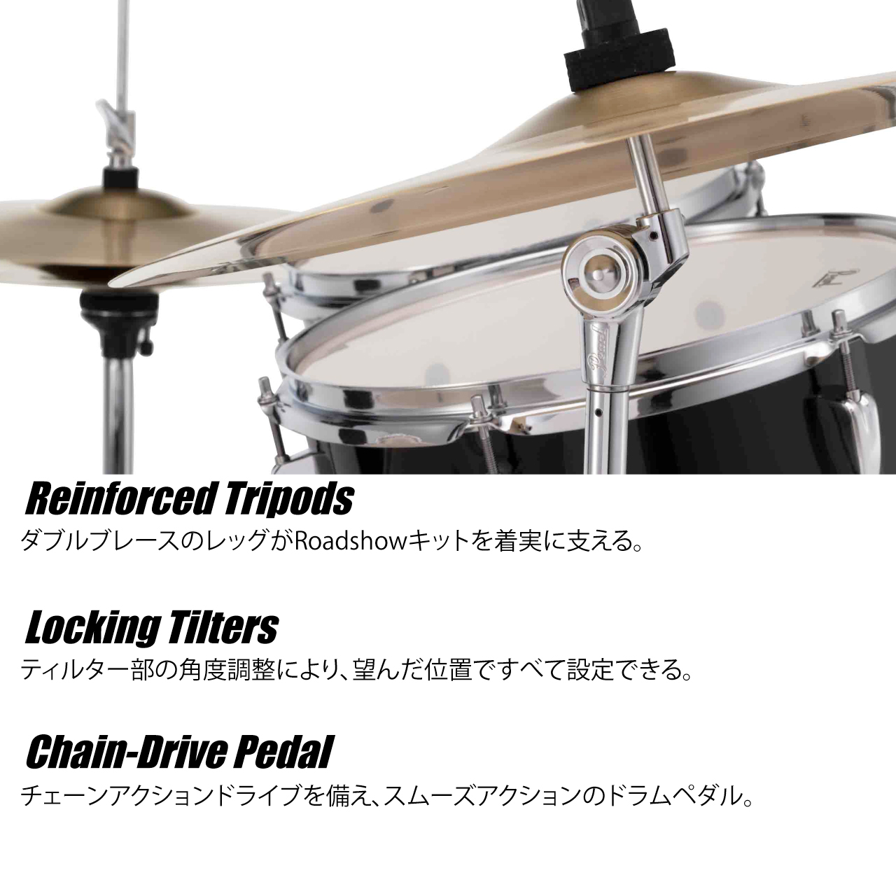 どんな偉大なドラマーも、ビギナーとして最初の1歩を踏み出し、様々な努力を積み重ねてきた結果その地位に存在する。その素晴らしいドラム人生を始めるための重要なツールとしてふさわしいのがこの“ROADSHOW”。おもちゃや中古からではなく、本格的な新しいドラムセットで旅路のスタートをきって欲しい。