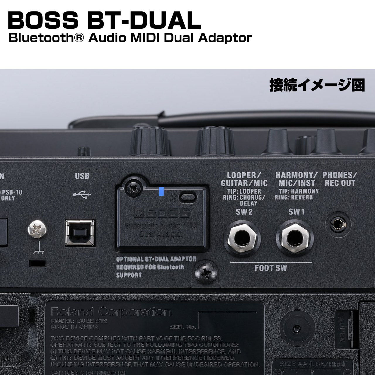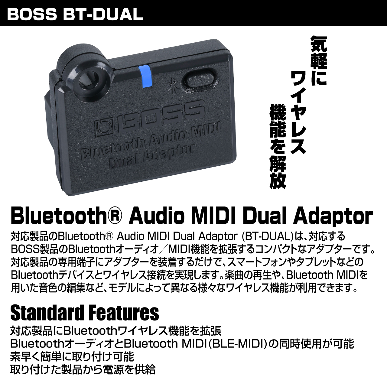 対応製品のBluetooth® Audio MIDI Dual Adaptor (BT-DUAL)は、対応するBOSS製品のBluetoothオーディオ/MIDI機能を拡張するコンパクトなアダプターです。