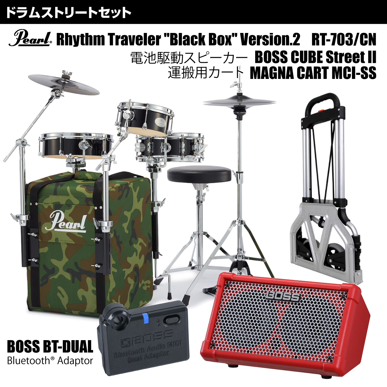 Pearl パール RT-703/CN #CM 移動用カート 電池駆動スピーカー CUBE STREET II RD Bluetooth接続 BT-DUAL ドラムセット ストリート 持ち運びRhythm Traveler Black Box Ver2 RT-703/CN と 移動に便利なマグナカートと電池駆動スピーカーCube Streetのセット!