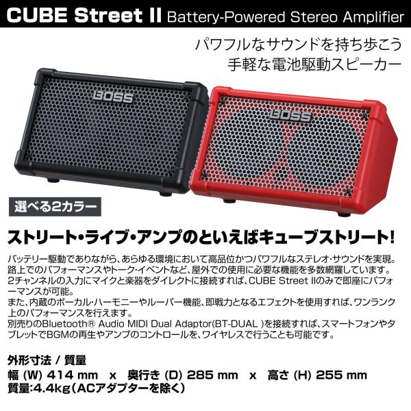 ストリート・ライブ・アンプのベストセラーRoland CUBE Streetが、BOSS CUBE Street IIとして生まれ変わりました。バッテリー駆動でありながら、あらゆる環境において高品位かつパワフルなステレオ・サウンドを実現。路上でのパフォーマンスやトーク・イベントなど、屋外での使用に必要な機能を多数網羅しています。2チャンネルの入力にマイクと楽器をダイレクトに接続すれば、CUBE Street IIのみで即座にパフォーマンスが可能。また、内蔵のボーカル・ハーモニーやルーパー機能、即戦力となるエフェクトを使用すれば、ワンランク上のパフォーマンスを行えます。