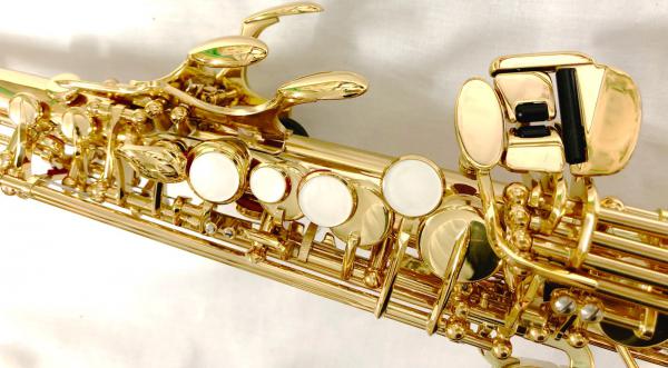 正規品 技術スタッフ調整品 ▼ネックの取り外しと上位モデルとの違い YSS-475は一体式のストレートのソプラノサックス。ネックを取ることはできません。まっすぐですので、ストラップの設置などを含め演奏スタイルは限られてきますがストレートの一体型が最も明るい音色で、鋭さと華やかさがあると言われます。ソプラノは高音が出過ぎるとクラシックや吹奏楽では少々つかいにくいのか、どちらかというとこのタイプはジャズなどで好まれる傾向にあると思います。 ソプラノサックスは結構値段が高いですが、このネック部分の違いが一番低価格対の楽器の左右する部分で、上位モデルはネックが取れるデタッチャブルタイプ。さらには、ネックの取り替えができるネック2本付きなどがございます。 ソプラノのこのネックの特徴は音色を左右する大きな特徴でもあり、吹奏楽などでは多くデタッチャブル(ヤマハでいうとYSS-675)が使用されます。より音をまろやかされたい場合にはデタッチャブルタイプのカーブドネックが使用されます。カーブドのネックは管体が少し下に降りるので構えやすく吹きやすいといったことから、ジャンルだけでなくデタッチャブルではカーブドネックの使用者は多いと思います。一体型の音色が劣るということではありませんので演奏スタイル、音色の好み、あとはご予算でお選び下さい。