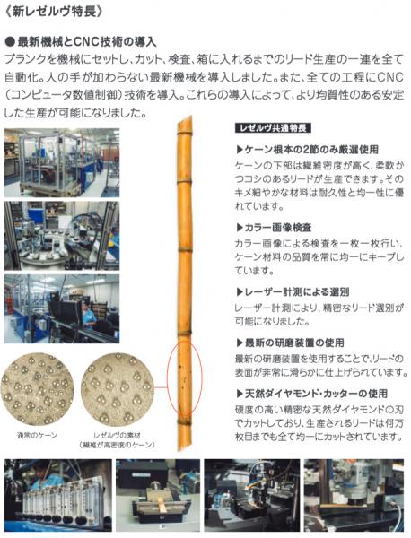 厳選した材料を使用:繊維密度が高いケーン根元の2節のみ使用。柔軟かつコシのあるリードが生産でき、耐久性にも優れています。