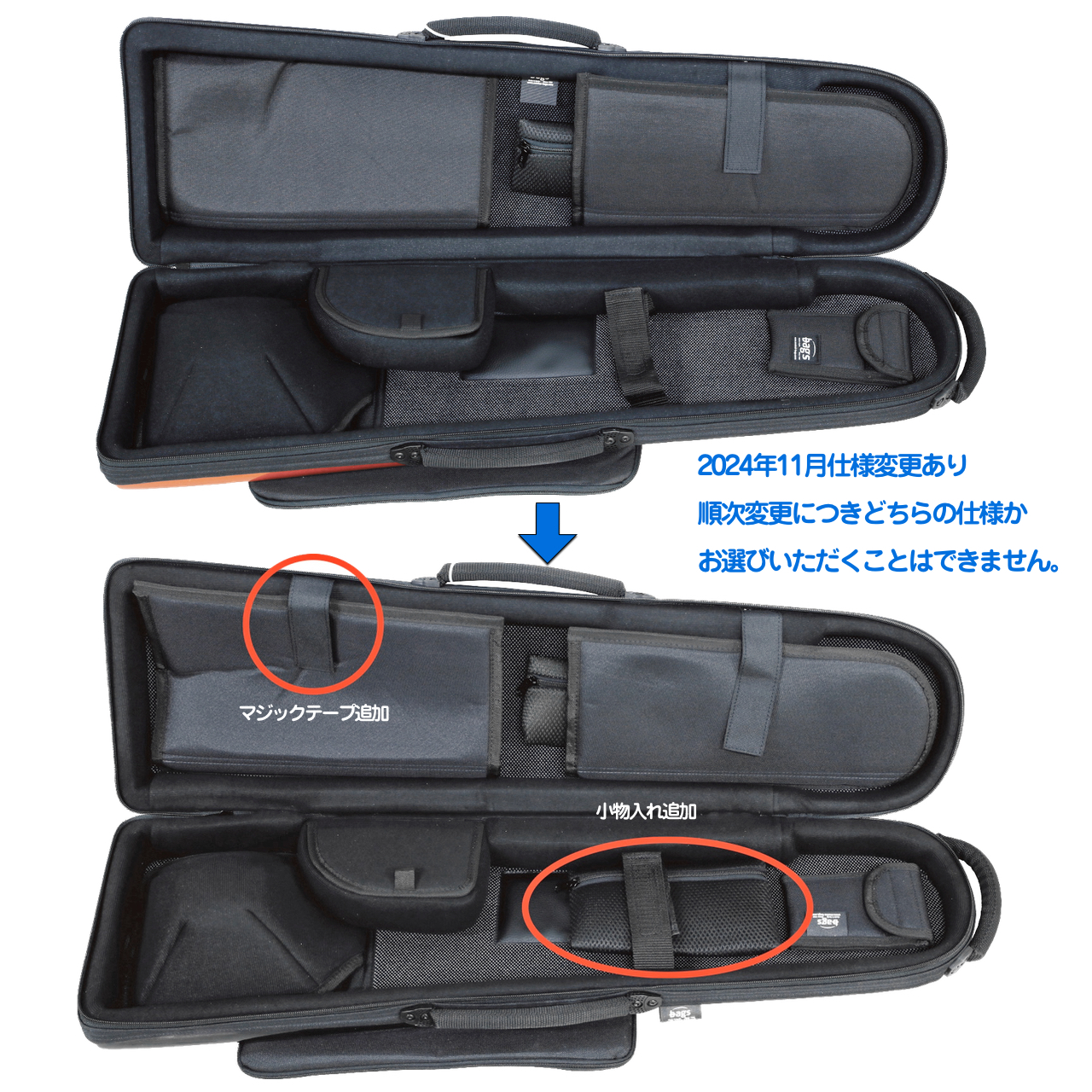 LITTINのようなベルカット部分がベルフレアに比較的近いものや、YAMAHA YSL-882ODのようなオープンラップモデルは収納が不可能です。