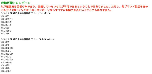 ベルサイズ8.5インチ以下のトロンボーンならすべてが収納できるということでもありません。 YSL-881 YSL-895EN YSL-897Z YSL-891Z YSL-630 YSL-455G YSL-354