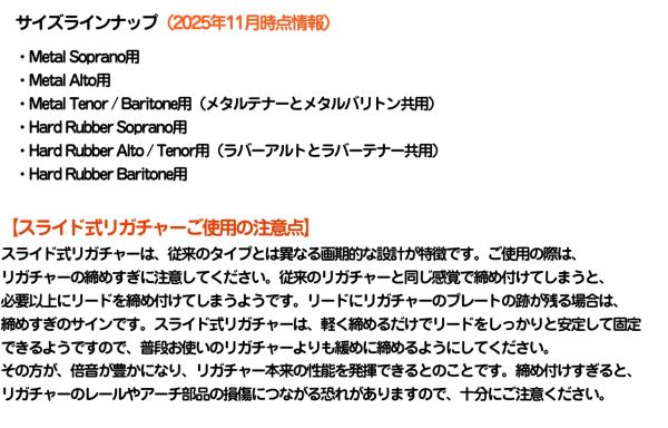 スライド式リガチャーは、従来のタイプとは異なる画期的な設計が特徴です。ご使用の際は、リガチャーの締めすぎに注意してください。従来のリガチャーと同じ感覚で締め付けてしまうと、必要以上にリードを締め付けてしまうようです。