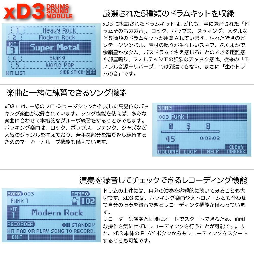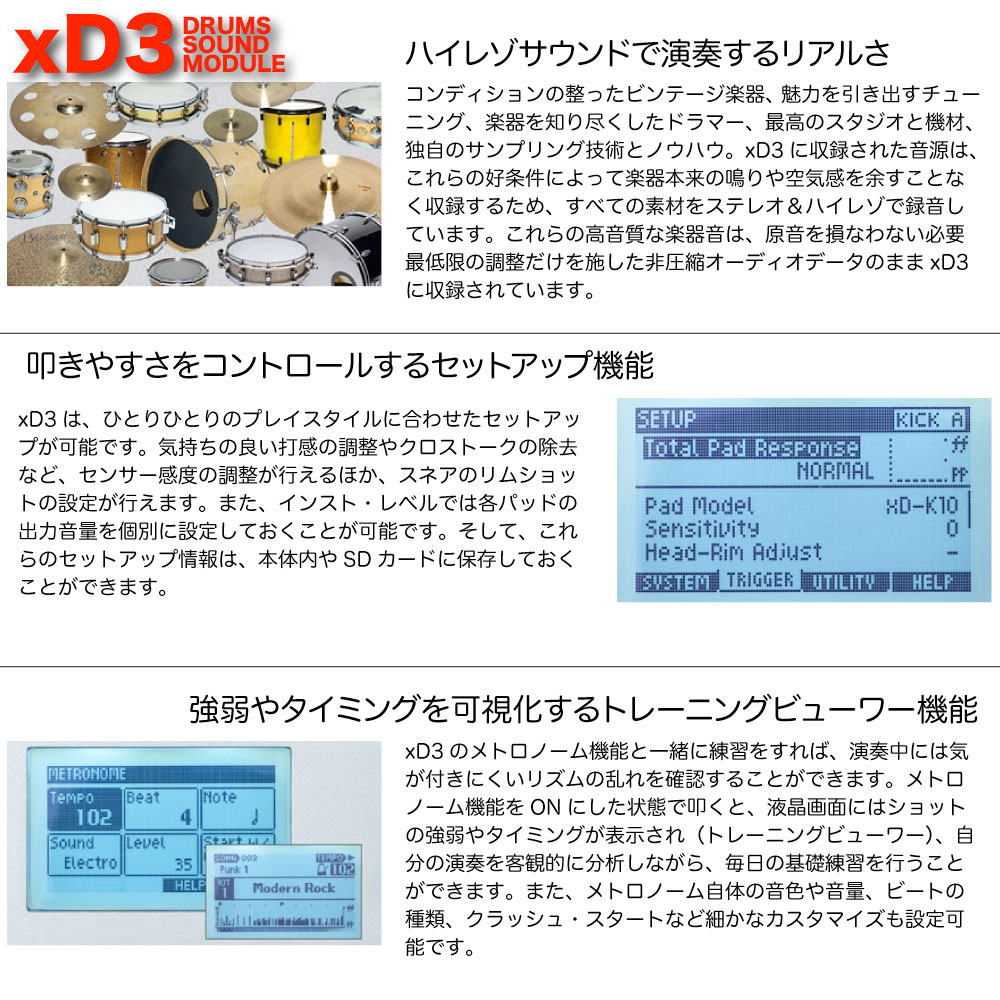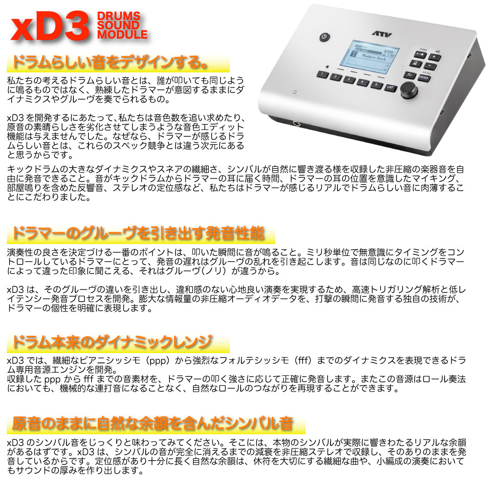 音源モジュール「xD3」は繊細なピアニシッシモ(ppp)から強烈なフォルテシッシモ(fff)までのダイナミクスを表現できるドラム専用音源エンジン。