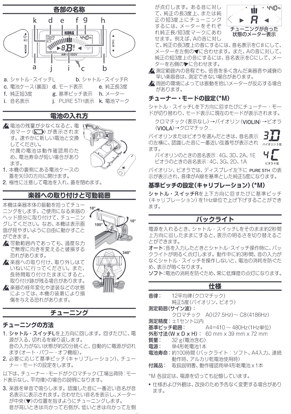 KORG CHROMATIC CLIP-ON TUNER violin viola AW-LT100V コルグ クリップオンチューナー バイオリン用 ビオラ用 クロマチックチューナー