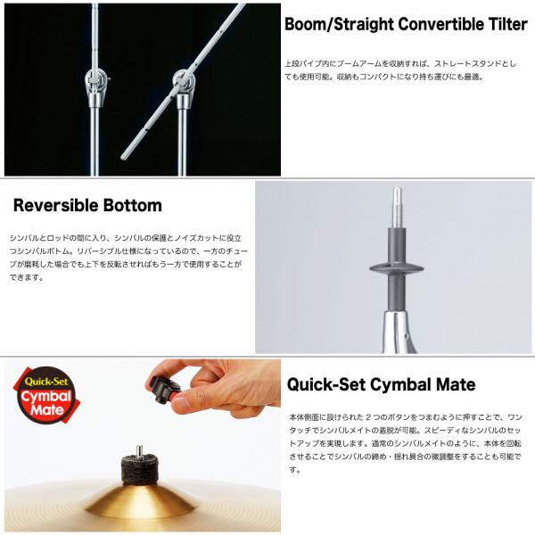 25.4mm径のベースパイプ、上級モデルのデザインを踏襲したダブルレッグ仕様のシンバルスタンド。リーズナブルな価格を維持しつつ、上段、中段パイプ径を上級モデルと同じサイズにすることで、安定感を向上させています。