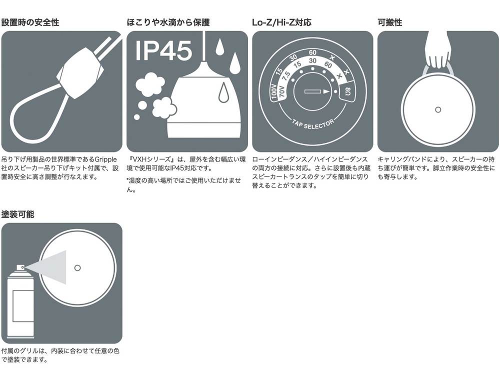 『VXH シリーズ』は、人間工学に基づいた見た目の圧迫感が少ない、円形状の筐体を採用しており、下から見上げた際に目立ちにくい、空間に溶け込むデザインとなっています。また、多様なインテリアに調和するため、筐体の上から塗装することも可能です。さらに、屋外での使用も想定した防水規格IP45 に準拠(※)しているほか、設置時に簡単かつ安全に高さを調節できるGRIPPLE 社のスピーカー吊り下げ用キットが付属しています。