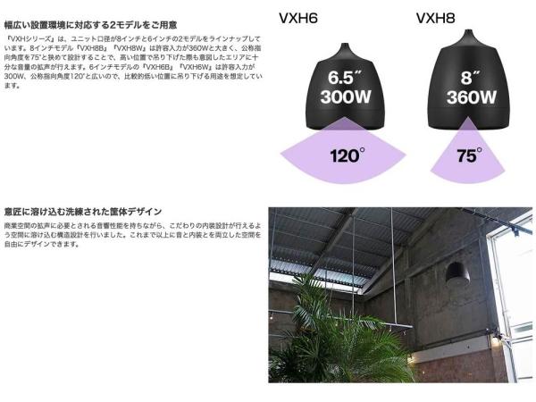 『VXH シリーズ』は特長が異なる2 モデルをラインナップしています。8 インチモデルは許容入力が360W と大きく、公称指向角度が75°と狭いので、より高い位置から意図したエリアに拡声できます。一方で『VXH6B/W』は許容入力が300W、公称指向角度120°と広いので、比較的低い位置で、広いエリアをカバーする用途で設計されています。2 モデルとも、それぞれブラックとホワイトの2 色のカラーバリエーションを持ち、空間の意匠に合わせて選ぶことができます。