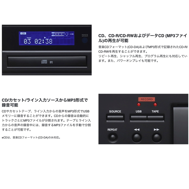 ・MP3ファイルの再生、CD、カセット、ライン入力からMP3形式で録音可能