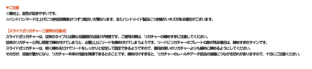 スライド式リガチャーは、従来のタイプとは異なる画期的な設計が特徴です。ご使用の際は、リガチャーの締めすぎに注意してください。従来のリガチャーと同じ感覚で締め付けてしまうと、必要以上にリードを締め付けてしまうようです。