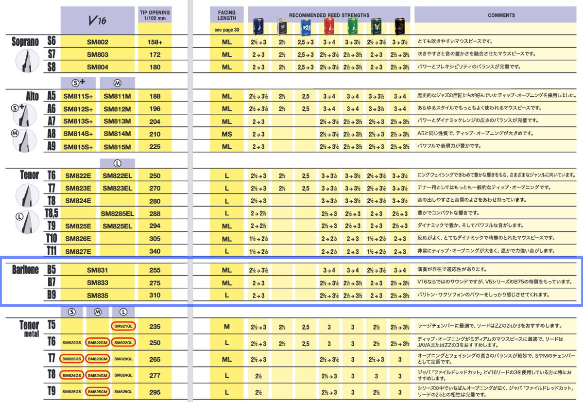 vandoren SM835 V16 series B9 baritone saxophone mouthpieces バンドーレン バリトンサクソフォン用 マウスピース SM-835V16シリーズ ジャズの新たなスタンダード。50年代の有名なアメリカン・アルトサクソフォンマウスピースの伝統を、ジャズ用エボナイト・マウスピースで実現しました。 JAVA、V16、そしてZZのリードにマッチするマウスピースです。バリトン・マウスピースの長い伝統に培われ製作されました。