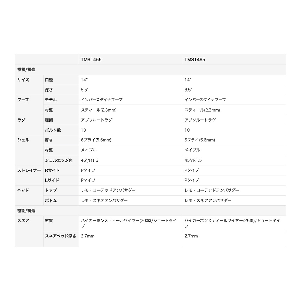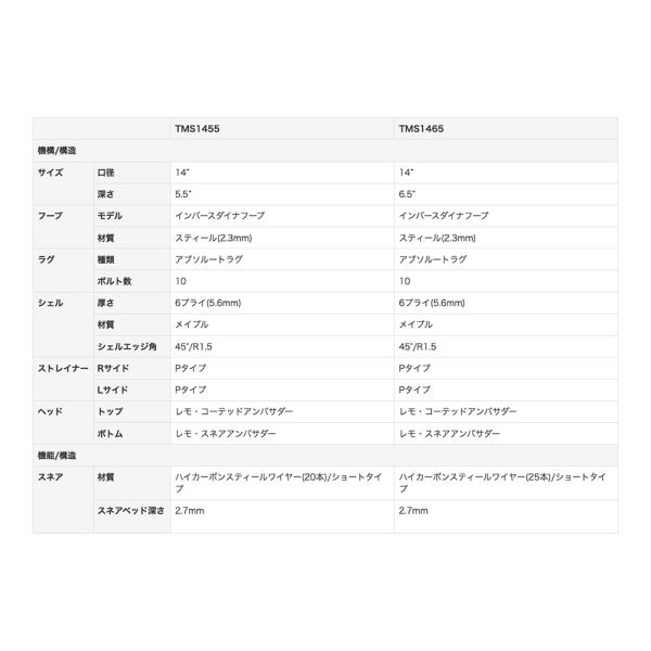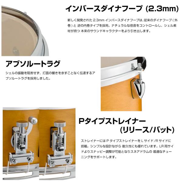 シェル:メイプル6プライ(5.6mm) - シェルエッジ角:45°/R1.5 - スネアベッド:深さ2.7mm