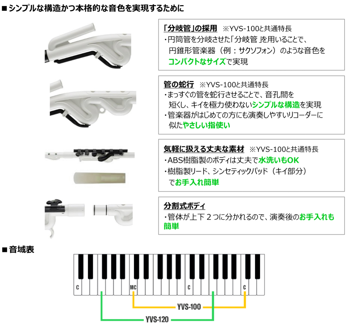ソプラノサックスのマウスピースが付いたYVS-100、アルトサックスのマウスピースが付いたYVS-120、違いは音域、音色、吹き心地。一概には言えませんが、管楽器経験者、リード楽器経験者、全くの未経験者で購入のポイントも変わってくると思います。