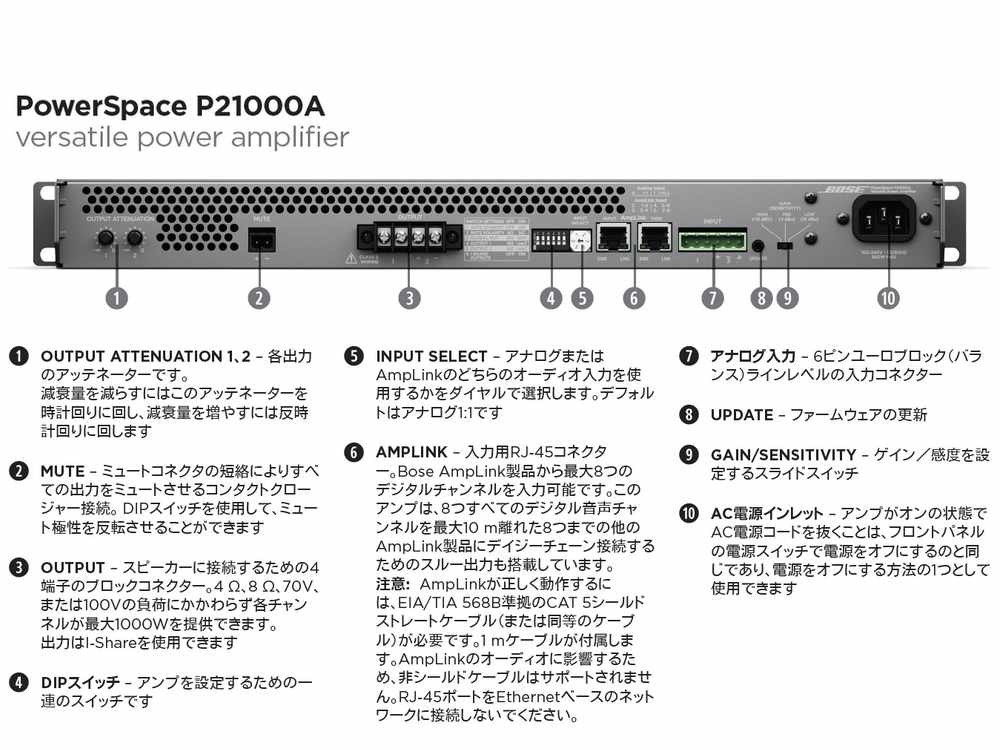 Bose AmpLink入力を搭載し、CAT 5ケーブル1本でBose DSPの低レイテンシー非圧縮デジタルオーディオマルチチャンネルに対応。