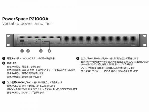 PowerSpace P21000Aは、各chごとに1000W出力を供給。ブリッジ接続不要でローインピーダンス/ハイインピーダンス伝送に対応し、フルチャンネルの出力を供給できます。二つのチャンネルを結合して単一ゾーンに2倍の出力を提供できる柔軟性も備えています。簡単な設置とシンプルな操作で、上質な商業空間向けサウンドシステムを構築できるPowerSpaceアンプで、ニーズにマッチする出力とパフォーマンスを。