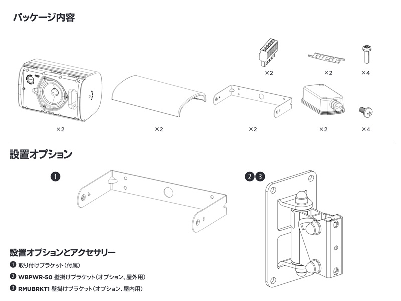 ・ハイインピーダンス : 100V: 5, 10, 20, 40 W, バイパス / 70V: 2.5, 5, 10, 20, 40 W, バイパス