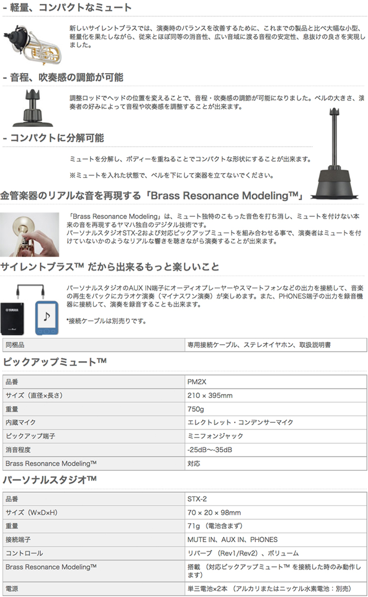 ・PM2X...Brass Resonance Modeling対応/ピックアップ端子:ミニフォンジャック/内蔵マイク:エレクトレット・コンデンサーマイク/消音程度:-25dB~-35dB/サイズ:210 × 395mm/重量:750g