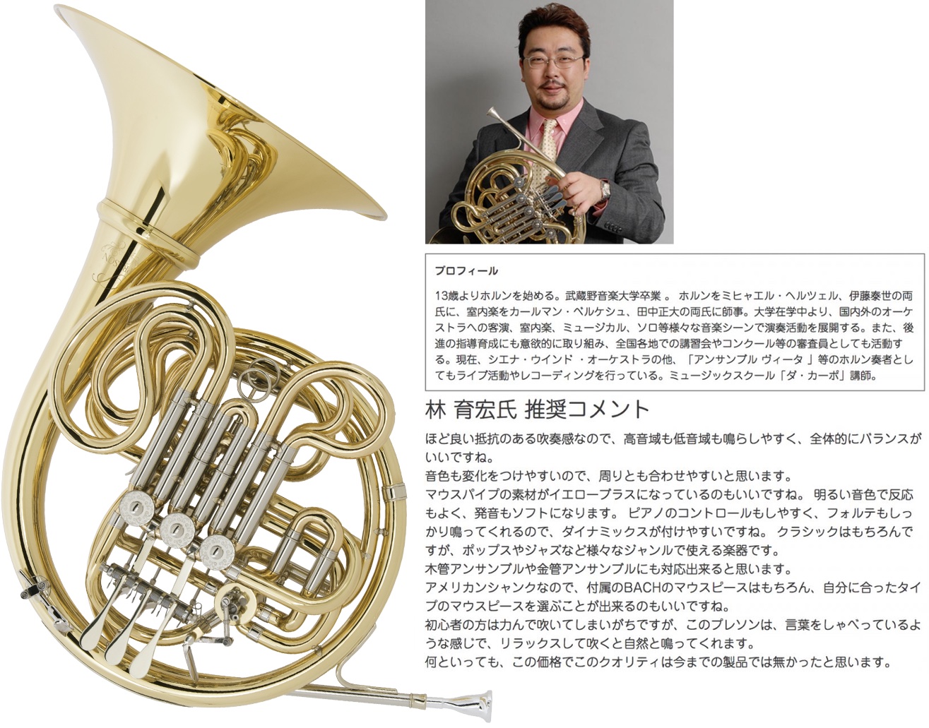 シンプルな構造で比較的一番安く手に入るホルンになります。自然で無理のない巻きによるスムーズな吹奏感。ホルンの基本の調がF調(inF)ですので、ホルン用の楽譜はFで書かれていることが多いです。移調読みをせずそのまま楽譜通り演奏できます。ナチュラル・ホルンに近い音色で、ホルン本来の豊な音色を充分に引き出し、太く深みのある落ち着きのある音色を奏でてくれることでしょう。管の長さからホルン吹きに必要な「上手な息の流れを作る練習」に適しています。息の圧力、スピード、アタックに対してシビアになれる楽器と言えるかもしれません。これで練習をはじめることによってB♭への持ち替えも楽だと思います。