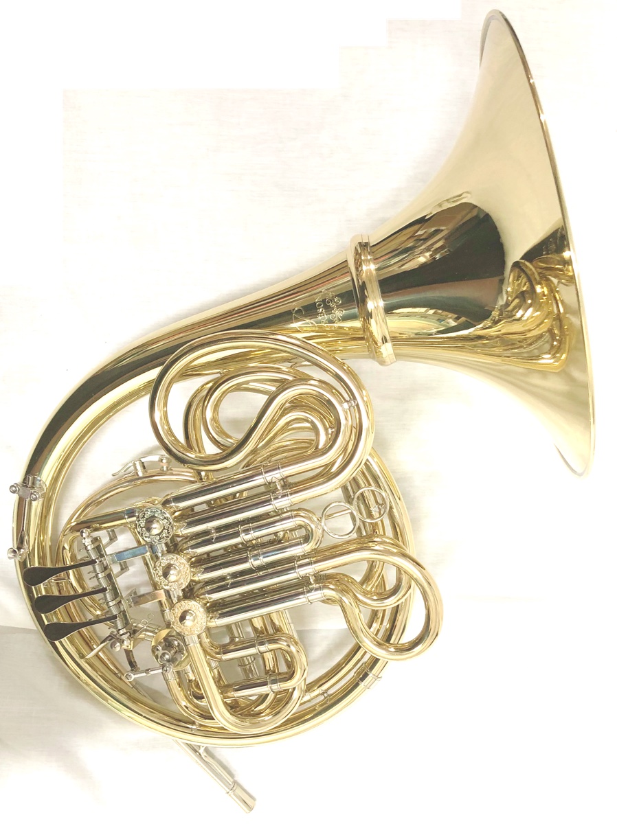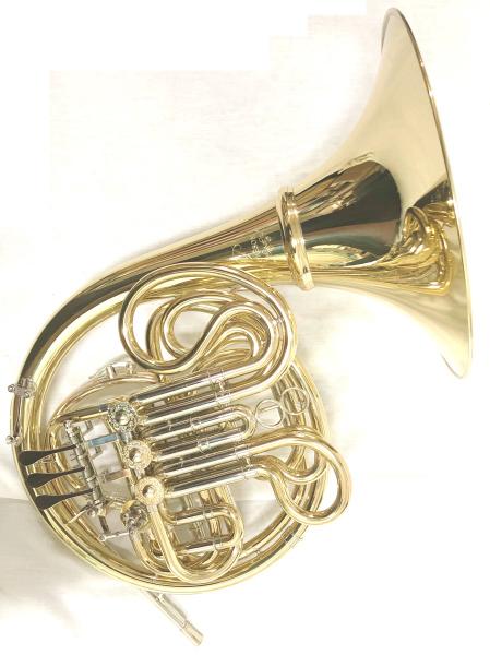 上記2つの調の管が1つになった楽器です。F管とB♭管の組み合わせが一般的で入門者でも先のことを考えこちらから使用することもあります。それぞれ独立した2つの調性をバルブで切り替えることができます。シングルに比較して音程、音色、正確性、パワーなどをレバーひとつで切り替えることで臨機応変に使い分けが出来るのですが操作性が良いということはそれだけ使用する管もパーツも多くなりますので、重さがあります。フルダブルが多く使われますが、「セミダブル」というものも存在します。同じ音域ですが、全体の管の長さが少し短いセミダブルにはB♭管と、B♭管につなげてF管に出来る補正管(迂回管)がついておりフルダブルより音の出る構造が短くなります。吹奏感は異なりますし、楽器の重さもそれだけ軽くなります。(シングルほどではない)ただしデメリットもあり、低いFの音を出す時にはF管のバルブセクションを通った後、B♭管のバルブセクションも通ることになり、管の中の凹凸を多く通る分、音が影響を受けます。近年多くの方はフルダブルから手にされるケースが多く、よく使われている楽器としてはヤマハの下のモデルですと、ケルントナー、Jマイケルが10万以内、その上にプレソンがあり、さらに上にヤマハがあるといった状況になると思います。プレソンホルンはこのフルダブルのみで、ヤマハで近いものの仕様で言うとYHR-567Dになります。