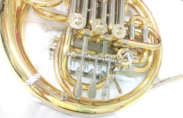フルダブルホルン(および一部のセミダブルホルン)は一般的に第4レバーを押してF管→B♭管に切り替える「押しB♭」での演奏が一般的ですが、こちらのモデルはその逆である「押しF」への変更が可能となっています。全くの初心者の方にはおすすめできませんが、変更を必要とされる方はB♭管を使って演奏することが多い方や手が小さい方が小指の負担軽減を目的とすることが多いです。初心者で手が小さい方はホルン用のプロテクターの使用も有効です。変更を行った場合でも譜読みやゲシュトップ、ミュートの使用時における影響は特に無く、第4レバー(親指)の運指のみが通常の逆となります。ただしこの運指に慣れるためには当然練習が必要になりますので、個人差はありますが数ヶ月かかる方もいらっしゃるようです。 押しFの状態でのお届けをご希望の場合はご注文時に備考欄にてお申し付け下さい。またお子様が使用される場合はレバーの高さを少し低めに調整することも可能です。(技術担当が不在の場合は調整に数日頂くことがございます。)取扱説明書にも記載がございますが、この調整は難易度が高く、お客様ご自身で行われると故障につながる可能性がありますので弊社までご依頼をお願い致します。※お届け後の調整等ご依頼につきましては別途往復送料のご負担をお願いしております。押しFへの変更/ロータリー動作チェックなど、出荷前調整と一緒でしたら無料にてご対応可能です。何かご希望などございましたらお申し付け下さいませ。