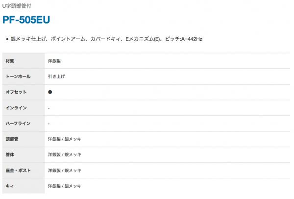 ・PF-505E...ストレート頭部管、カバードキイ、C管、Eメカ付き。いわゆる一番スタンダードで安いものです。ヤマハでいうとYFL-212と同等仕様です。 ▼頭部管 ・ストレート...一般的なまっすぐのもの。子供さん以外は基本こちらです。 ・U字頭部管...上記では演奏が困難な子供さんなどに使用されるU字になった頭部管。成長に合わせストレートも付属になっている本体もあります。