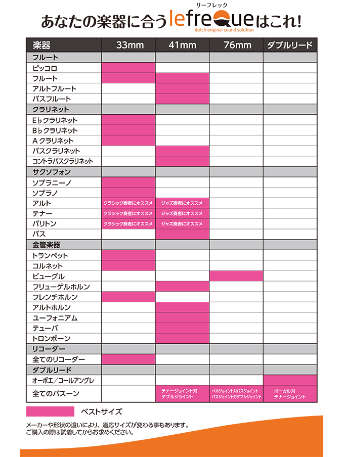 なおフルート、アルトサックス、テナーサックス、バリトンサックスは33mmと41mm両方が使用でき、33mmはクラシック向けで41mmは比較的ジャズ向けの音色となります。