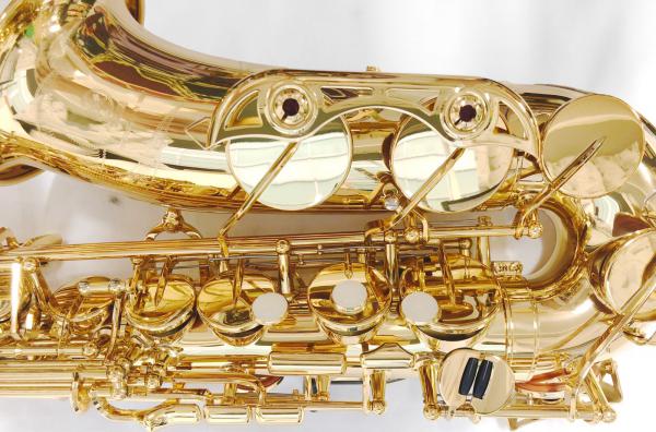 ヤマハのラインナップにはクリアラッカー仕上げはありませんがサックスや金管楽器の仕上げではよく使用されます。YAS-480はゴールドラッカー仕上げです。銀メッキ仕上げの楽器に比べて抵抗感が強くなく、初心者の方には吹きやすいです。