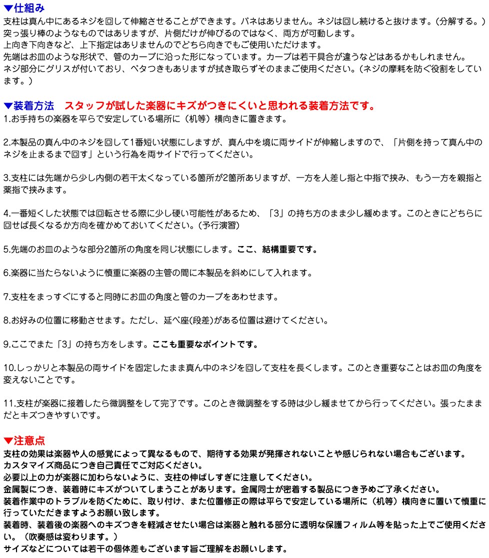 装着時、装着後の楽器へのキズつきを軽減させたい場合は楽器と触れる部分に透明な保護フィルム等を貼った上でご使用ください。(吹奏感は変わります。)