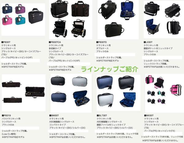 ▼B♭クラリネットケースラインナップ PB307...セミハードケース、ショルダーストラップ付き、別売バックパックストラップ(リュック)対応 PB307CA...セミハードケース、ショルダーストラップ付き、別売バックパックストラップ(リュック)対応、多収納タイプ MX307...軽量セミハードケース、ショルダーストラップ付き(2本)、リュックにすることも可能(別売のバックパックストラップには対応していない) BM307...ABS樹脂製ケース、ショルダーストラップ付き、バックパックストラップには対応していない、コンパクトタイプ BLT307...ABS樹脂製ケース、ショルダーストラップ付き(2本)、リュックにすることも可能(別売のバックパックストラップには対応していない)、譜面ファイル付き LX307...セミハードケース、ショルダーストラップ付き、リュックストラップ付き(別売のバックパックストラップには対応していない)、ジッパー式メッセンジャーセクション付き