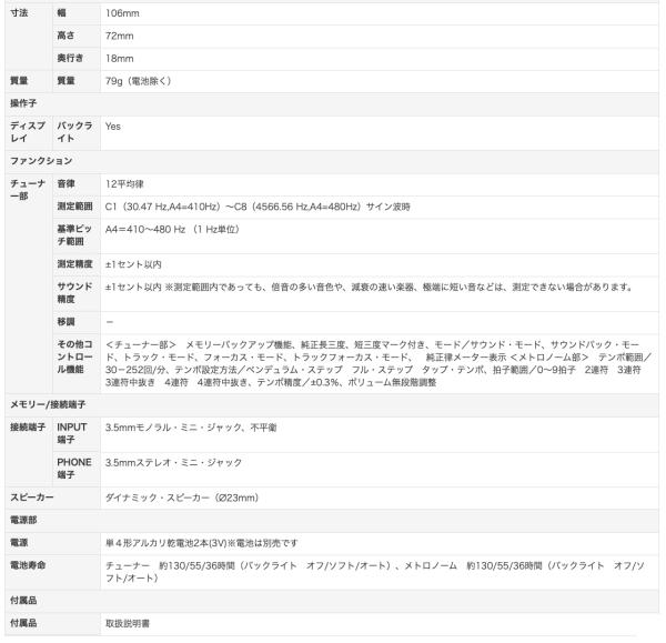 トラック・モード:ピッチの揺れ幅を演奏後に表示する機能。演奏中に画面を見なくてもよいため、チュ-ナーに頼らず安定したピッチを目指す練習が出来ます。 フォーカス・モード:ピッチの表示範囲を通常の±50セントから±25セントに変更する機能。表示目盛りが細かくなるため、より詳細にピッチの傾向をつかむことができます。
