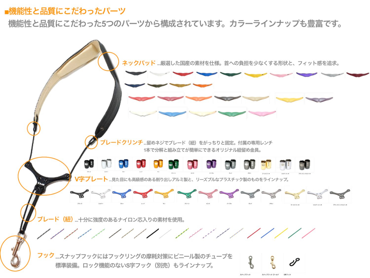また、カラーバリエーションが豊富なカスタムパーツや、パッドの両面、ステッチの色を自由に選べるカラーオーダーでは、自分好みのカラフルなストラップを作ることができます。
