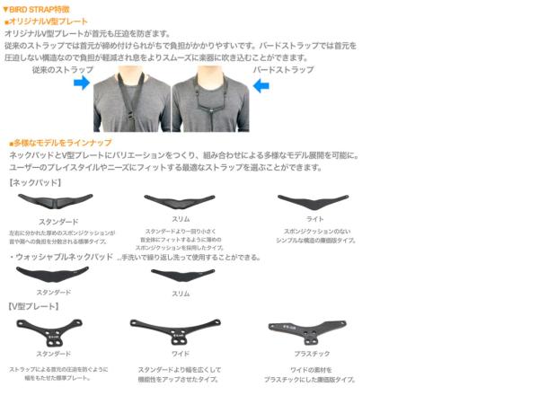 オリジナルV型プレートは首元も圧迫を防ぎます。従来のストラップでは首元が締め付けられがちで負担がかかりやすいです。バードストラップでは首元を圧迫しない構造なので負担が軽減され息をよりスムーズに楽器に吹き込むことができます。