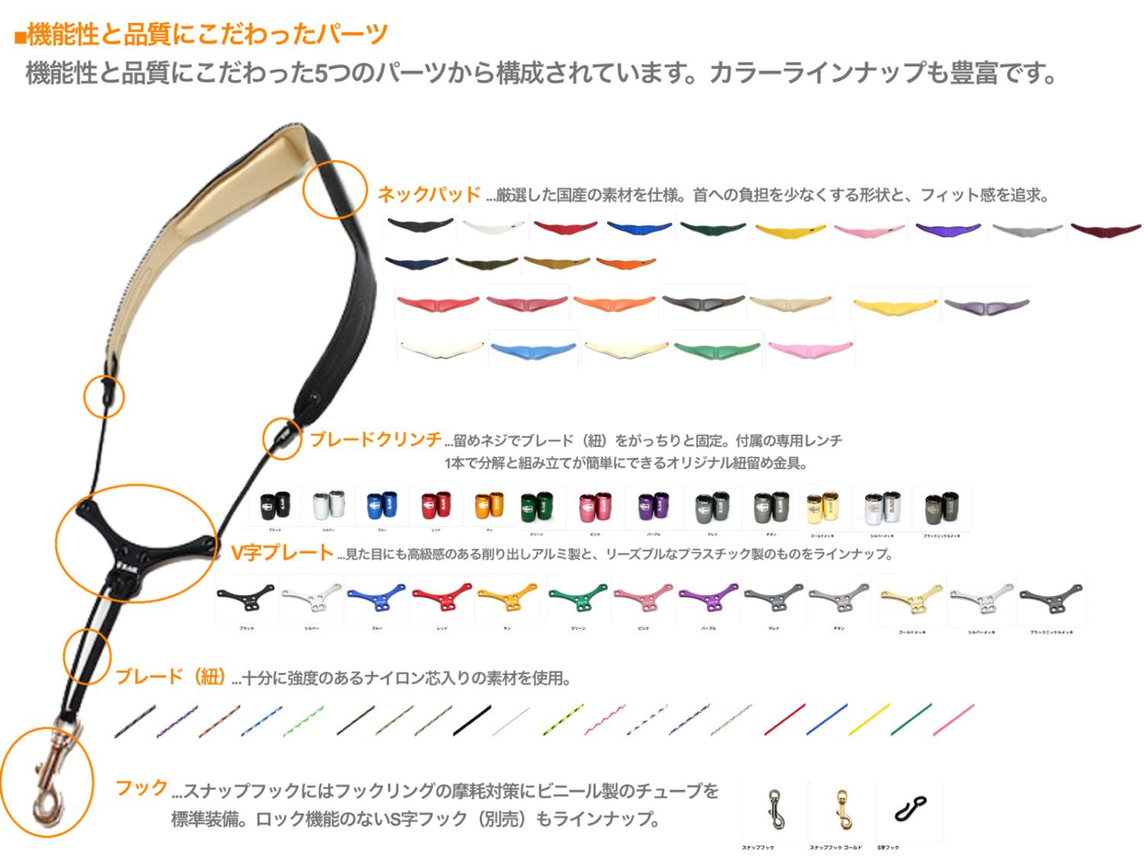 また、カラーバリエーションが豊富なカスタムパーツや、パッドの両面、ステッチの色を自由に選べるカラーオーダーでは、自分好みのカラフルなストラップを作ることができます。