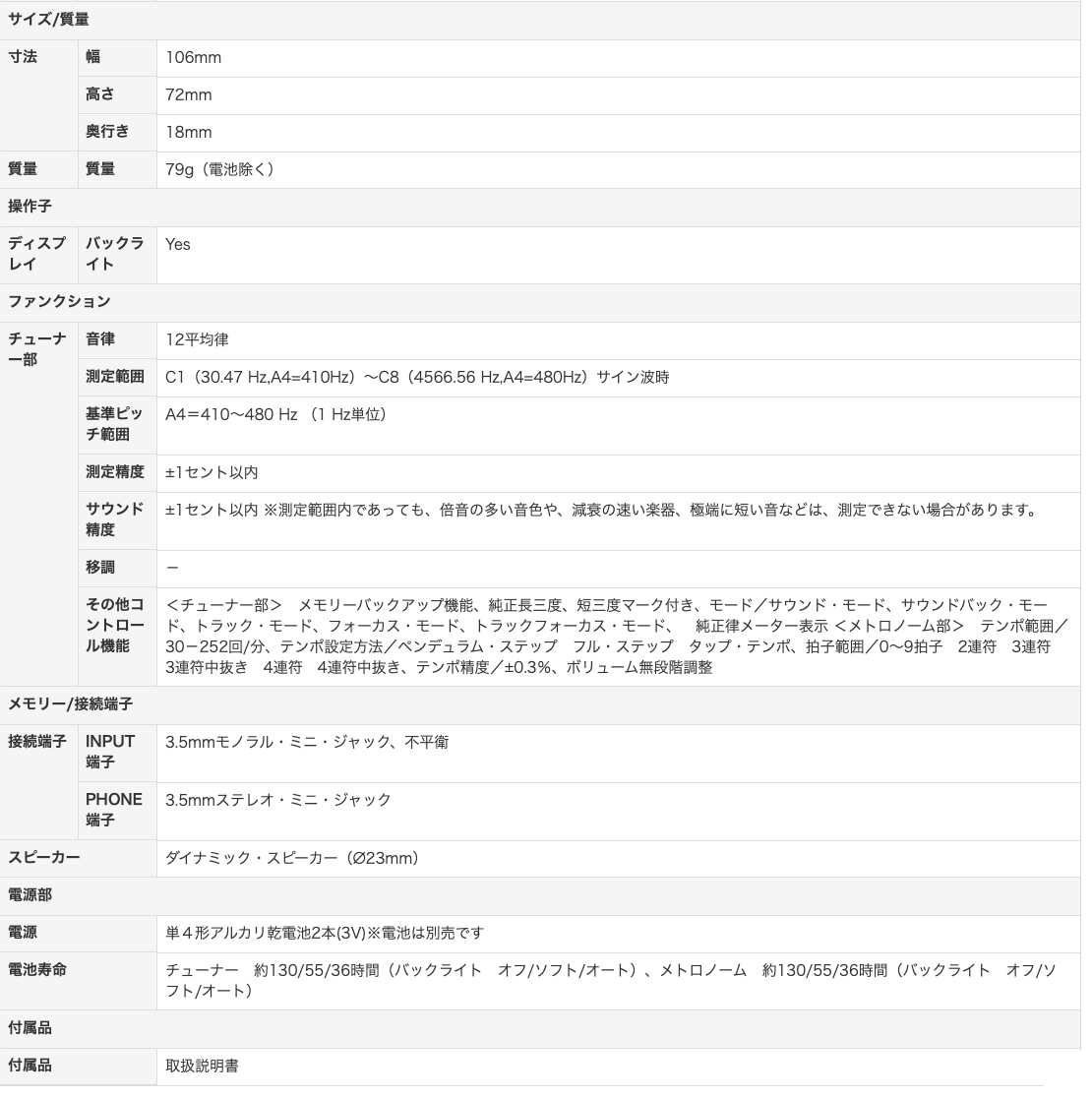 ■おおよその電池寿命:チューナー 約130/55/36時間(バックライト オフ/ソフト/オート)、メトロノーム 約130/55/36時間(バックライト オフ/ソフト/オート)
