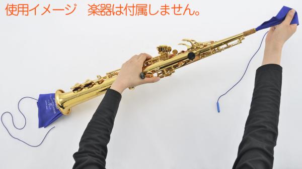 こちらはソプラノ用としてネック一体型にも使用できるマルチタイプ。スワブ布をよく伸ばしてから使用してください。両端の紐でスワブを往復させればより効果的です。途中で抵抗を感じた場合は無理に引っ張らず、反対側の紐を引いて抜いてください。